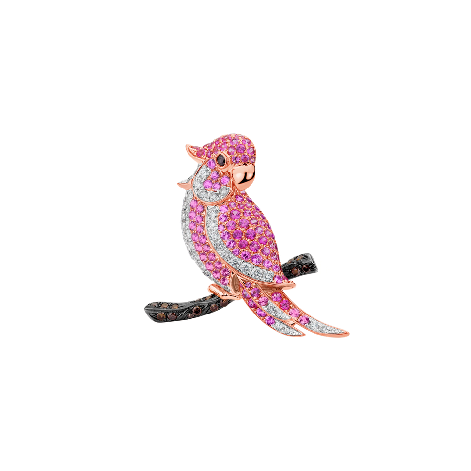 Exkluzívna brošňa z 18kt ružového a čierneho zlata s čiernym a hnedým diamantom a zafírovou ružovou je dokonalým symbolom elegancie a luxusu. Jeho precízne spracovanie a krásny lesk vás očaria na prvý pohľad. Šperk je súčasťou kolekcie Animals.