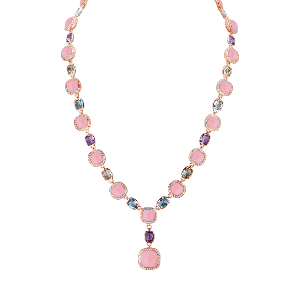 18kt náhrdelník z ružového zlata s diamantom a drahými kameňmi je ako poklad strateného kráľovstva. Jeho trblietavý diamant a drahé kamene symbolizujú luxus, silu a lákavú krásu. Šperk je súčasťou kolekcie Blossoms.