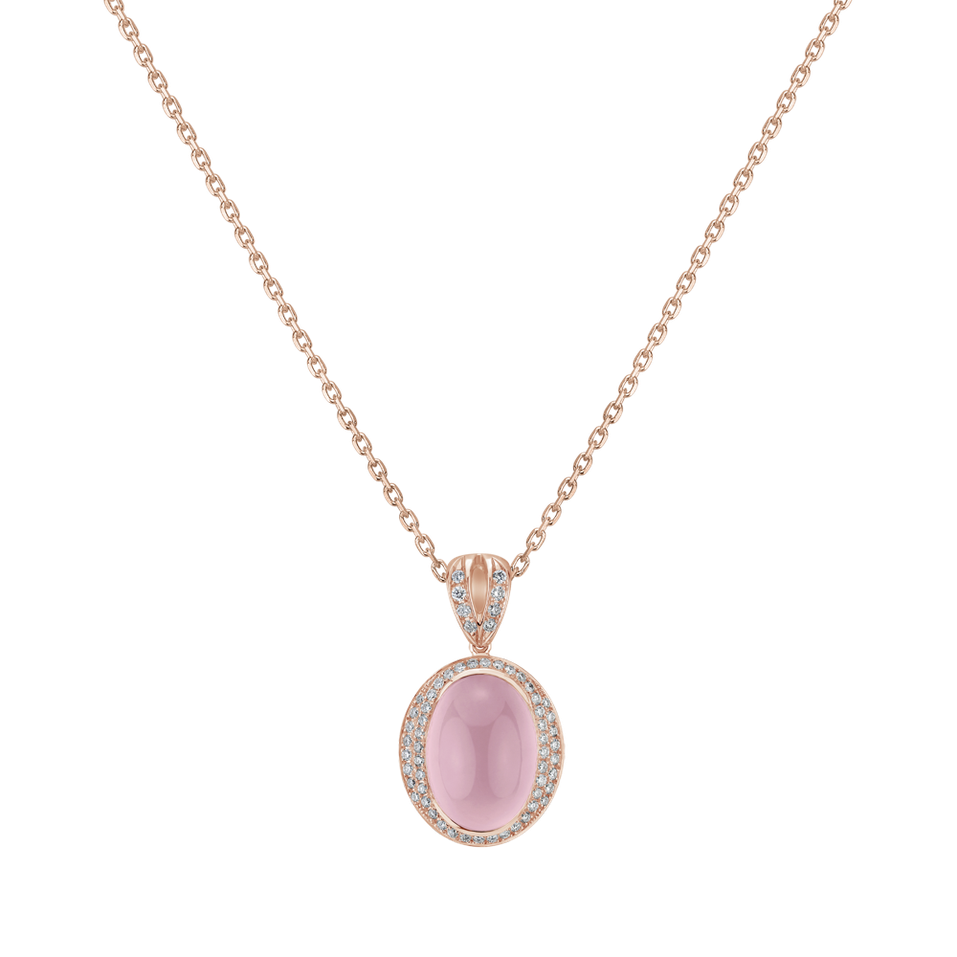 Majte blízko svojho srdca tento prívesok z ružového zlata 18kt s diamantmi a ružovým kremeňom, ktorý sľubuje, že zachytí každý lúč svetla a radosti každého rozprávkového dňa. Šperk je súčasťou kolekcie Blossoms. Kolekcia inšpirovaná rozkvitnutými sadmi a záhradami. Hlavnú úlohu zohrávajú farebné drahokamy s polkruhovým výbrusom cabochon. Modré topásy, fialové ametysty, zelený chalcedón a ďalšie drahokamy sú zasadené do bielych, žltých a ružových zlatých prsteňov, náušníc a príveskov. Zaoblené tvary šperkov a samotné kamene sú stelesnením nadčasovosti a jemnej ženskej energie. Spoločnosť ALO diamonds vyrába v Čechách šperky z diamantov a drahých kameňov už takmer 30 rokov. Každý šperk je tak originál a je tiež opatrený certifikátom pravosti a dodaný v luxusnom balení. Či už vyberáte zásnubný prsteň alebo diamantový náramok alebo náhrdelník, nedarujete s nami iba šperk, ale aj múdru investíciu. Prívesok sa dodáva bez retiazky. Retiazku je možné doobjednať na posta@alo.sk