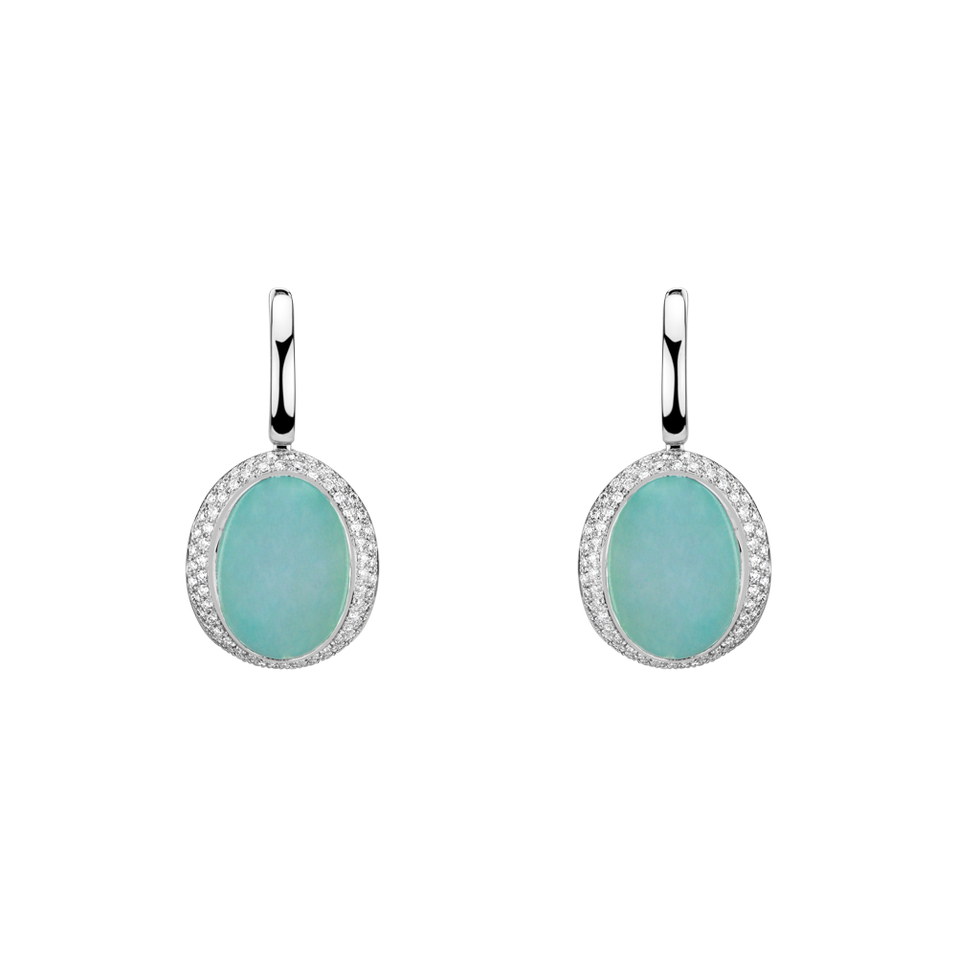 Exkluzívne náušnice zo 14kt bieleho zlata, zdobené krásnym chalcedónom, sú majstrovským dielom šperkárskeho umenia. Ich jedinečný dizajn a mimoriadna krása tyrkysového chalcedónu odhaľujú skutočnú eleganciu. Šperk je súčasťou kolekcie Blossoms.