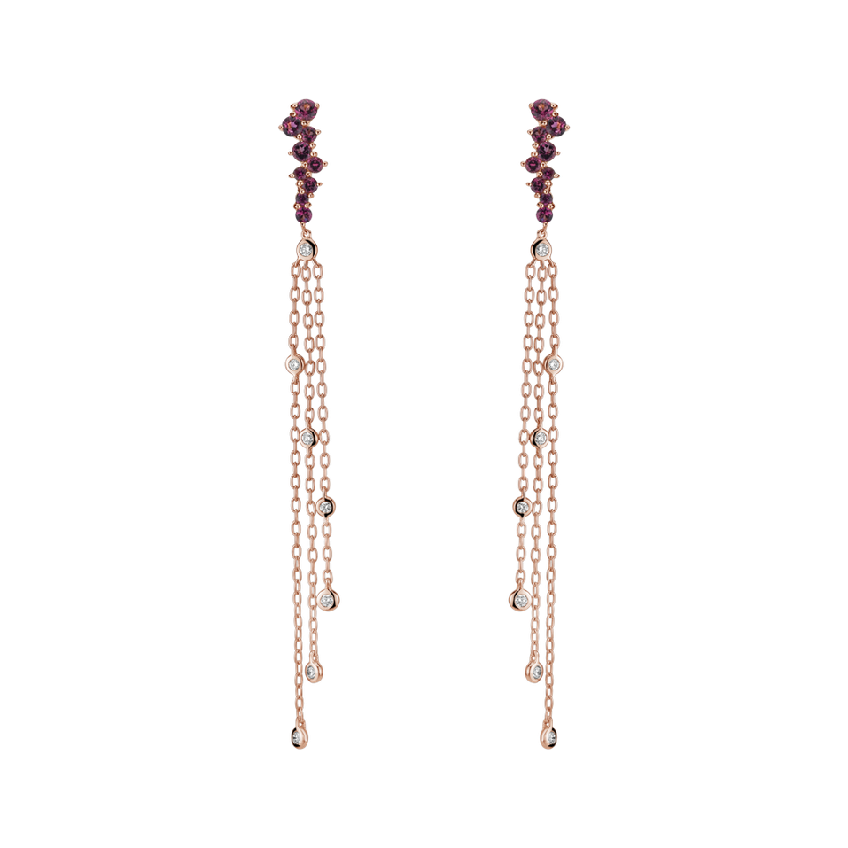 Náušnice vyrobené z 18kt ružového zlata, zdobené diamantmi a krásnym fialovým turmalínom, sú vyjadrením elegancie a luxusu. Ich dizajn vás očarí. Šperk je súčasťou kolekcie Charming.