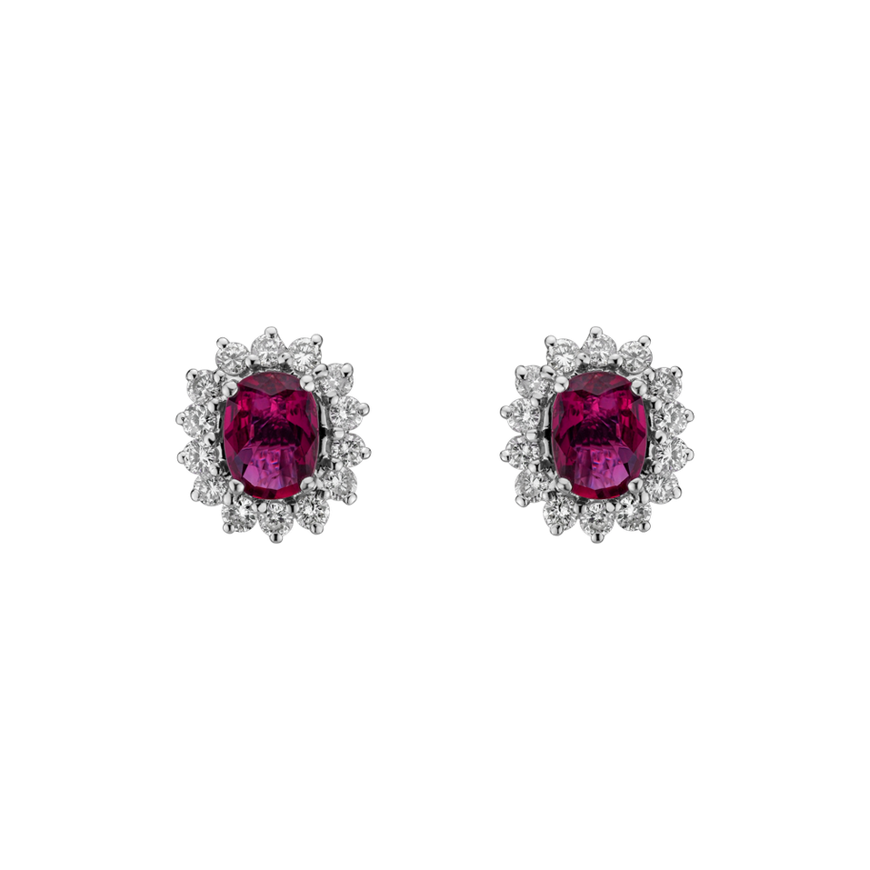 18kt náušnice z bieleho zlata s diamantmi a rubínom sú vyjadrením romantiky aj sily. Tieto náušnice kombinujú diamanty a rubín a vytvárajú prázdnu bridlicu pre nekonečný príbeh lásky a vášne. Šperk je súčasťou kolekcie Diana.