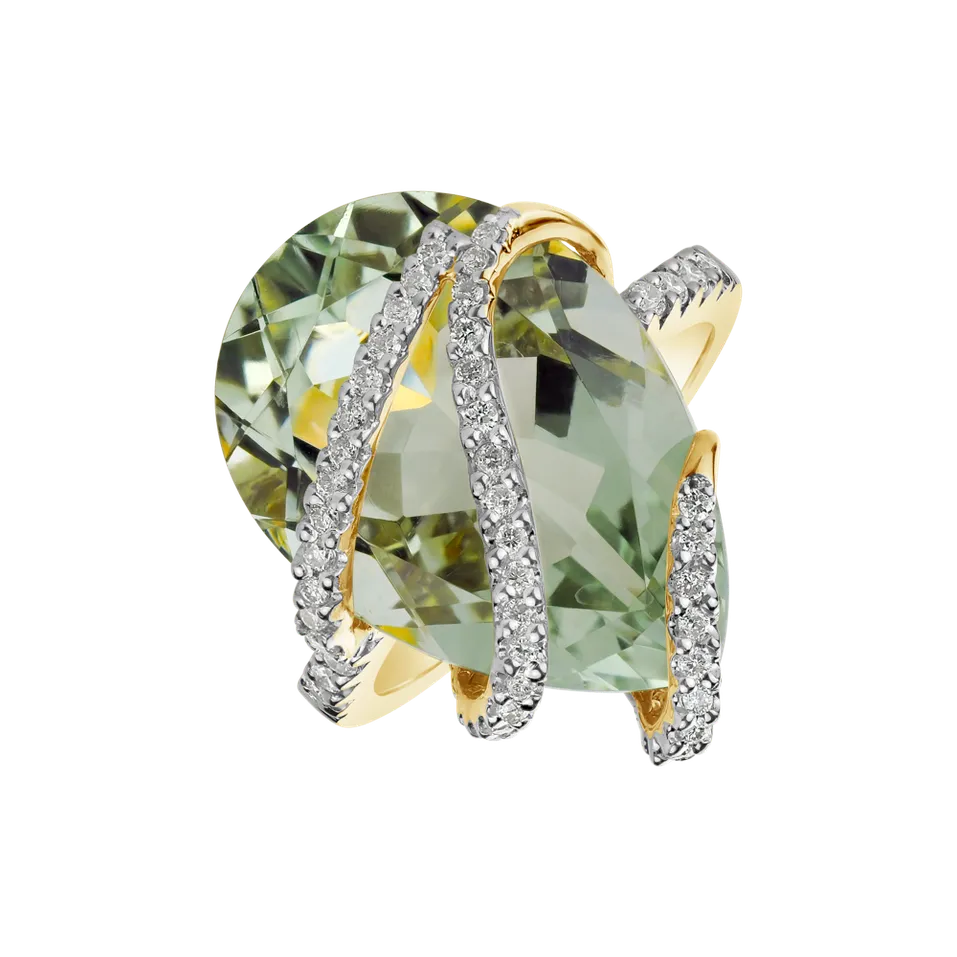 Jemná krása tohto 18kt žlto-bieleho zlatého prsteňa s diamantmi a ametystovou zelenou je oslavou životných úspechov. Jeho neprekonateľná brilancia a dokonalý vzhľad pripomínajú neuhasiteľnú túžbu dosiahnuť svoje sny. Šperk je súčasťou kolekcie Fantasy.