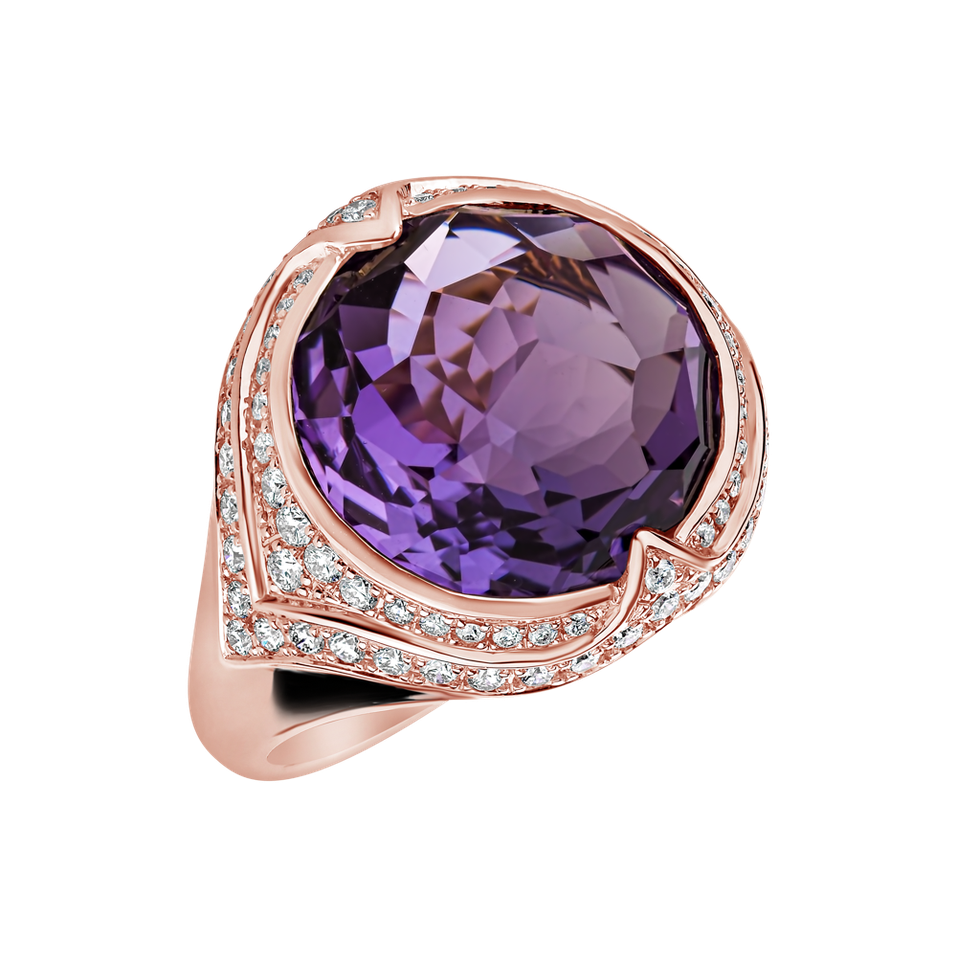 18kt prsteň z ružového zlata s diamantmi a brazílskym ametystom je ako poklad strateného kráľovstva. Jeho trblietavé diamanty a vzácny ametyst brazília symbolizujú luxus, silu a lákavú krásu. Šperk je súčasťou kolekcie Fantasy.