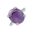 Jemnosť a elegancia sú kombinované v tomto prsteni vyrobenom zo 14kt bieleho zlata s diamantmi a ametystom africkým. Jeho jemný dizajn je dokonalým doplnkom pre každú dôležitú príležitosť, dodáva šmrnc a zároveň zdôrazňuje jemnú krásu nositeľa. Šperk je súčasťou kolekcie Blossoms.