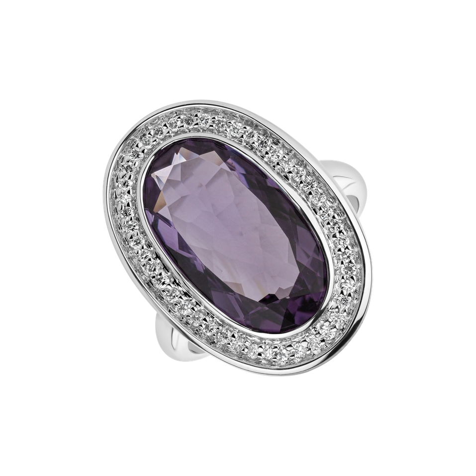 So svojím prsteňom z bieleho zlata 18kt v roku ??????? V kombinácii žiary diamantov a ametystov z Brazílie vysiela jasný signál – záväzok lásky, ktorý je obrovský ako hlbiny oceánu. Poklad, ktorý v sebe nesie nielen krásu a luxusný diamantový lesk, ale aj silu a hĺbku vašich pocitov. Šperk je súčasťou kolekcie Fantasy.