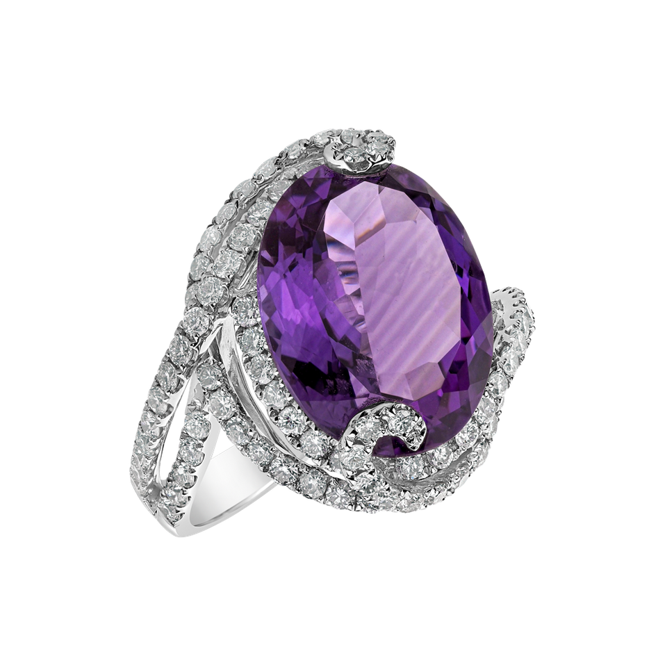 Tento prsteň z bieleho zlata 18kt s diamantmi a ametystovým africkým je majstrovské dielo, ktoré odráža víziu a odhodlanie. Jeho očarujúci dizajn je prejavom úspechu a odvahy, vytvorený pre tých, ktorí si cenia kvalitu a eleganciu. Šperk je súčasťou kolekcie Fantasy.