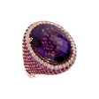 Tento prsteň z ružového zlata z 18 karátu, pokrytý diamantom, zafírovou ružovou farbou a ametystovým africkým prsteňom, kombinuje krehkosť s trvalosťou a je pozdravom samotnej krásy. Jeho nádherná kombinácia bude s vami po celý život. Šperk je súčasťou kolekcie Fantasy.