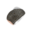 18kt prsteň z bieleho, ružového a čierneho zlata s hnedými diamantmi je perfektnou kombináciou jednoduchosti a elegancie. Čistý dizajn, hnedé diamanty a kombinácia troch farieb zlata zapôsobia na každého, kto ho uvidí. Šperk je súčasťou kolekcie Charming.