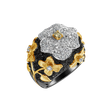Elegantný prsteň vyrobený z 18kt čierneho, bieleho a žltého zlata zdobený hnedými a čiernymi diamantmi je symbolom luxusu a sofistikovanosti. Ideálny darček pre ženu, ktorá ocení precíznosť a remeselné spracovanie šperkov. Šperk je súčasťou kolekcie Flowers.