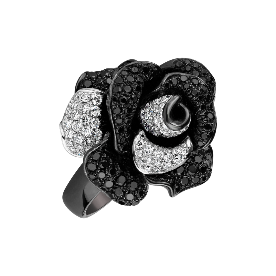 Elegantný prsteň vyrobený z 18kt bieleho a čierneho zlata zdobený oslnivými čiernymi diamantmi. Tento prsteň je symbolom luxusu a elegancie, ktorý vám prinesie nespočetné množstvo momentov obdivu od ostatných. Vďaka svojmu jedinečnému dizajnu a kvalite sa stanete stredobodom pozornosti na každej spoločenskej udalosti. Šperk je súčasťou kolekcie Flowers.