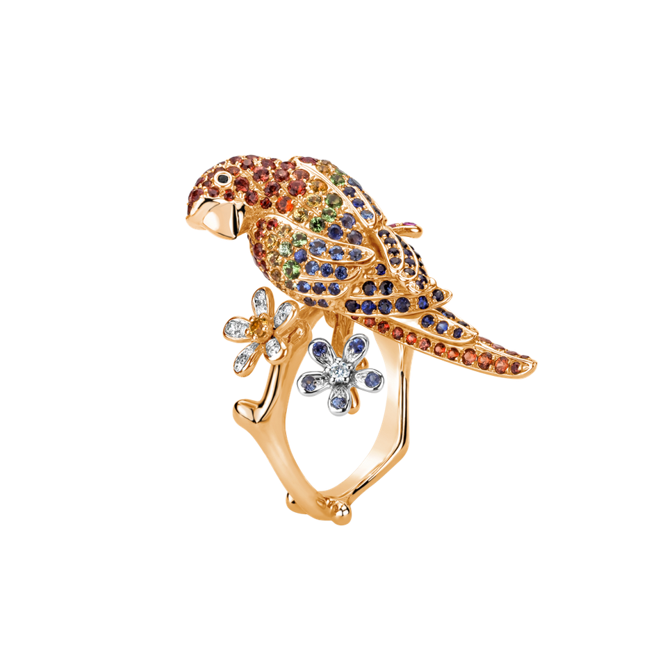 Prsteň s čiernymi a bielymi diamantmi, granátmi a zafírmi Alluring Parrot