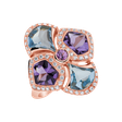 18kt prsteň z ružového zlata s diamantmi a drahými kameňmi je dokonalým vyjadrením elegancie a nadčasovosti. Jeho vynikajúci dizajn a precízne vložené drahokamy odrážajú svetlo a vytvárajú jedinečný efekt, ktorý oslavuje krásu a sofistikovanosť nositeľa. Šperk je súčasťou kolekcie Blossoms.