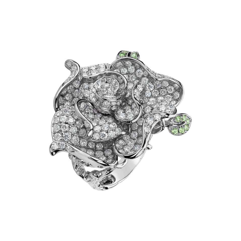 Tento elegantný prsteň z 18kt bieleho zlata s brilantným a zeleným granátom je dokonalou harmóniou krásy a elegancie. Jeho decentný dizajn a lesklé kamienky vytvárajú exkluzívny kúsok, ktorý upúta pozornosť na prvý pohľad. Šperk je súčasťou kolekcie Flowers.