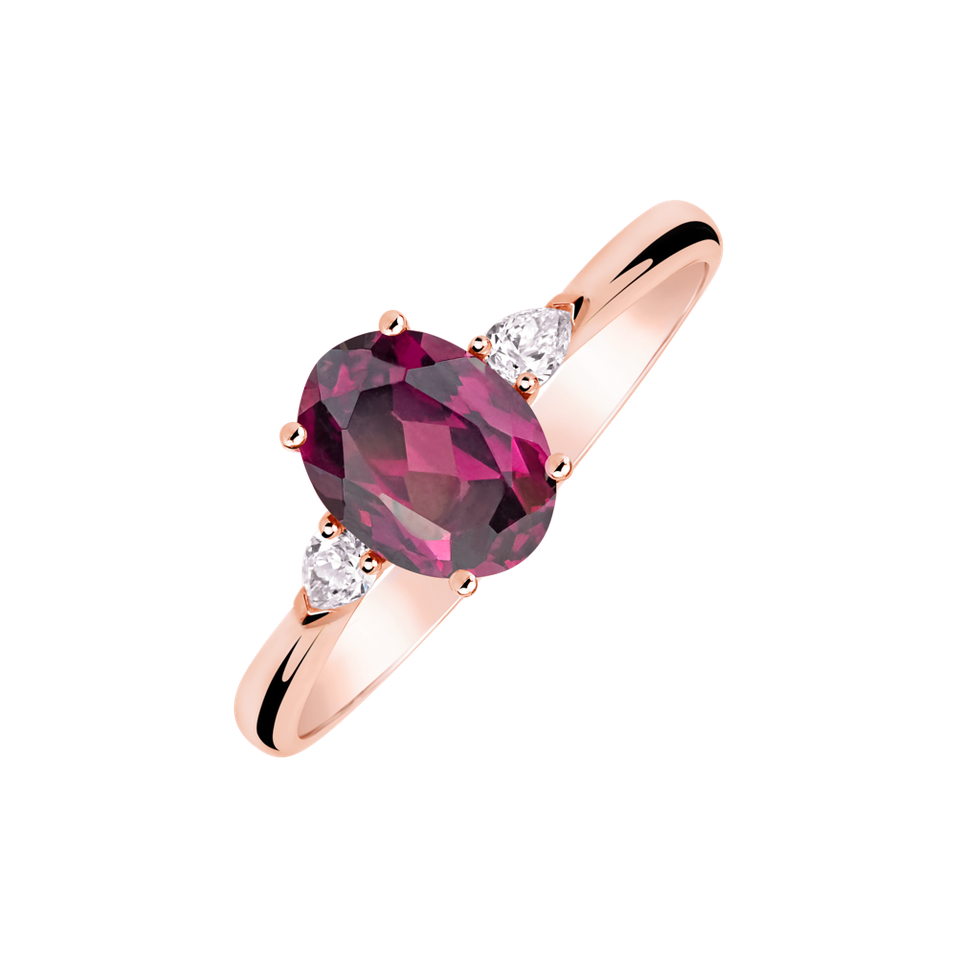 Klasický design zásnubního prstenu v moderním provedení. Oválný centrální rhodolit je po stranách zdoben dvěma menšími diamanty, což vypadá opravdu úchvatně.