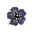 Ohromujúci prsteň z 18kt bieleho a čierneho zlata zdobený diamantmi, ktoré mu dodávajú nezabudnuteľné čaro. Tento šperk je dokonalým doplnkom pre elegantné večery a špeciálne príležitosti. Jeho diamanty a zafíry spoločne vytvárajú harmóniu vyžarujúcu krásu a luxus. Šperk je súčasťou kolekcie Flowers.