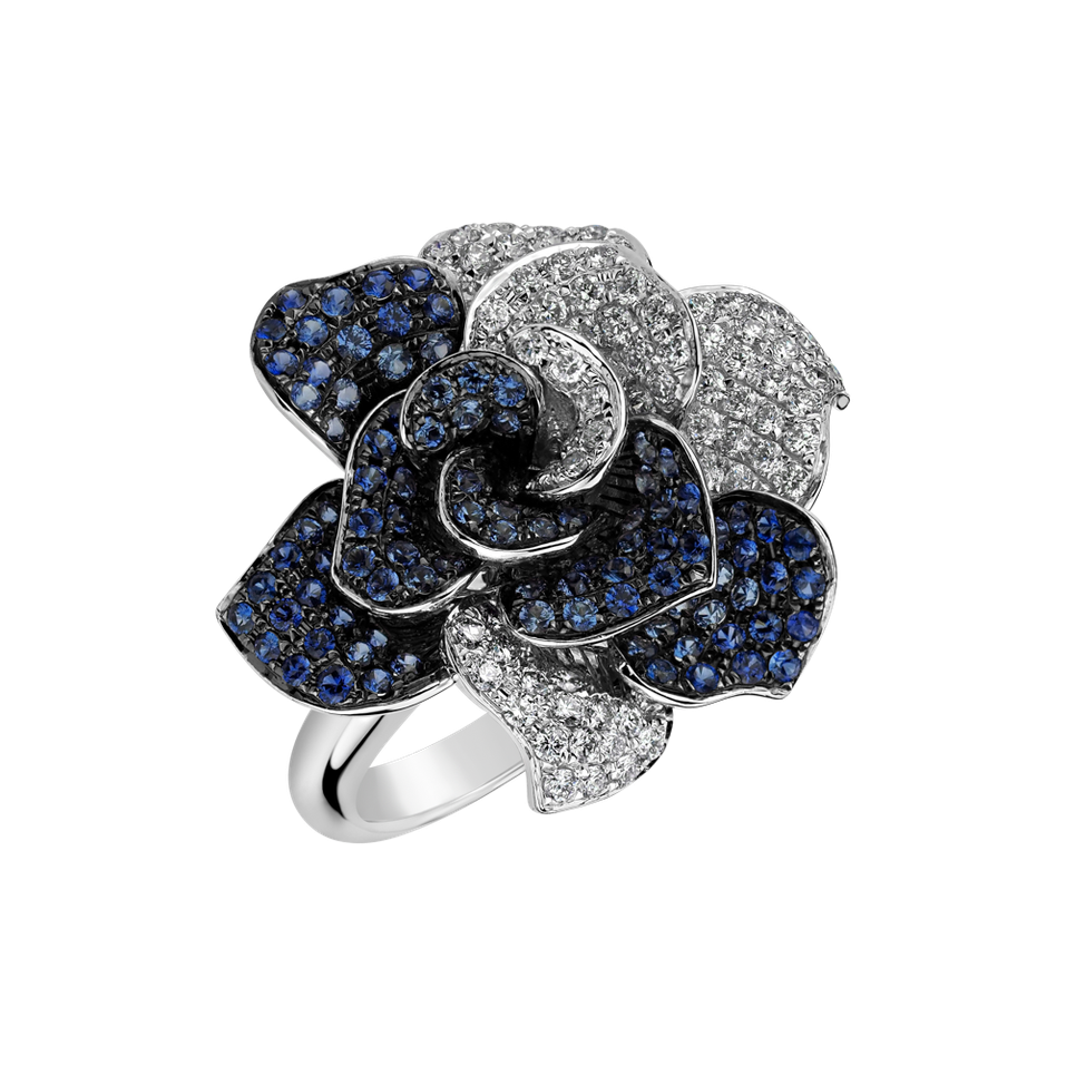 Tento prsteň z bieleho a čierneho zlata, pokrytý diamantmi a zafírom, je poctou triumfu a elegancie. Každý kameň žiari ako symbol úspechu, prestíže a výnimočnosti. Vyrobené pre ženu, ktorá si zaslúži to najlepšie. Šperk je súčasťou kolekcie Flowers.
