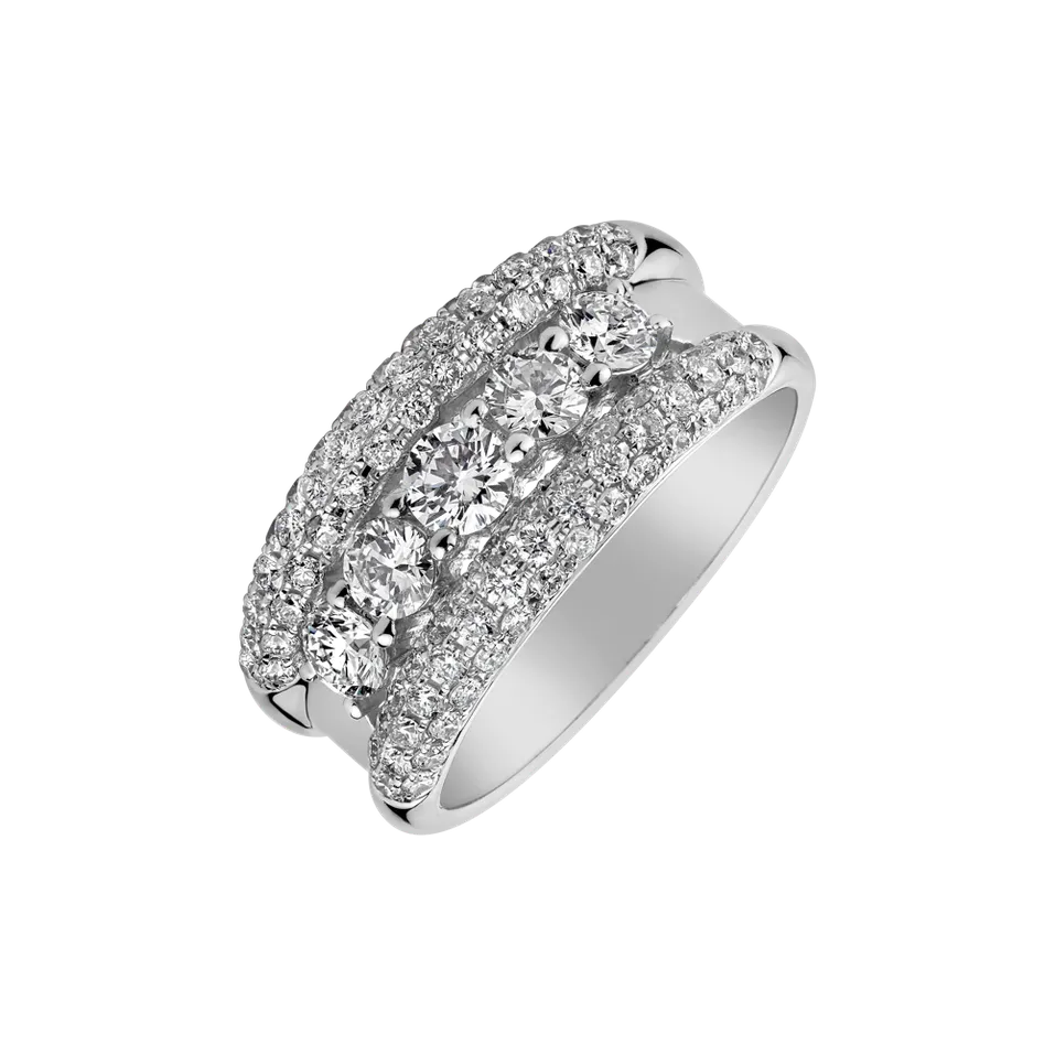 Diamanty a precíznosť. 18kt prsteň z bieleho zlata s diamantmi je majstrovským dielom ručnej práce a ozdobou pre tých, ktorí poznajú hodnotu skutočnej krásy a sily. Šperk je súčasťou kolekcie Charming.