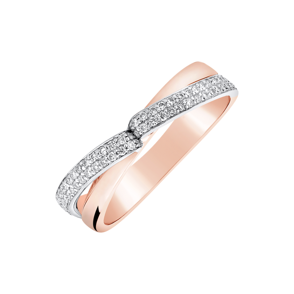Tento prsteň vyrobený zo 14kt ružového a bieleho zlata s diamantmi zaujme svojou jedinečnou kombináciou farieb a krásnym dizajnom. Jeho krivky a trblietavé diamanty vás pozývajú na oslavu lásky a radostných spoločných chvíľ. Šperk je súčasťou kolekcie Essential.