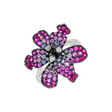 Elegantný prsteň vyrobený z 18kt bieleho a čierneho zlata s diamantovou, rubínovou a zafírovou viacfarebnou farbou, ktorý vyžaruje jedinečnú noblesu a rafinovanú chuť. Tento prsteň je dokonalou zmesou elegancie a jemného lesku, ktorý z neho robí výrazný doplnok na každú príležitosť. Šperk je súčasťou kolekcie Flowers.