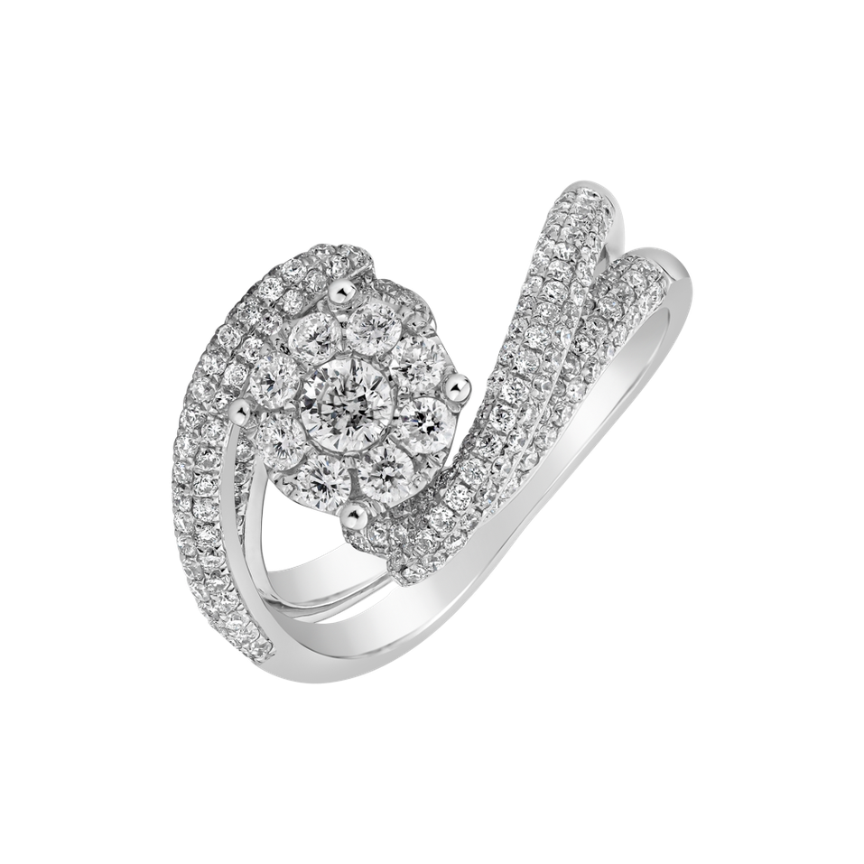 Diamanty a precíznosť. 18kt prsteň z bieleho zlata s diamantmi je majstrovským dielom ručnej práce a ozdobou pre tých, ktorí poznajú hodnotu skutočnej krásy a sily. Šperk je súčasťou kolekcie Mirage.