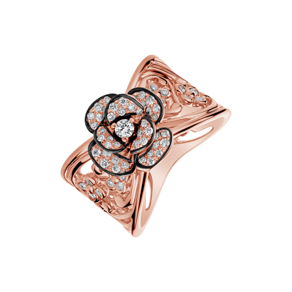 Kráľovský prsteň s diamantmi zasadený do krásnej 18kt ruže a čierneho zlata je skutočným odrazom prestíže a elegancie. Jeho jedinečná krása a žiarivá žiara stelesňujú luxus a exkluzivitu. Šperk je súčasťou kolekcie Flowers.