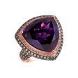 Tento prsteň z ružového a čierneho zlata s kapacitou 18kt je ozdobený krásnymi hnedými diamantmi a africkými ametystmi. Je dokonalým doplnkom pre každú osobnosť s chuťou. Jeho jedinečný dizajn a nádherné kamene dodávajú šperkom žiarivú eleganciu. Bude skvelým doplnkom vášho outfitu a prinesie vám veľa komplimentov. Šperk je súčasťou kolekcie Fantasy.