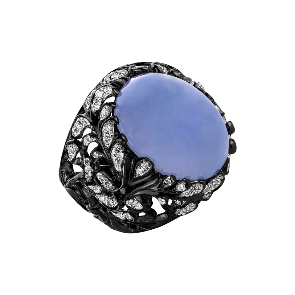 Tento prsteň z čierneho zlata s hmotnosťou 18kt s diamantmi a modrým mesačným kameňom je majstrovské dielo, ktoré odráža víziu a odhodlanie. Jeho žiarivý dizajn je oslavou úspechu a dokonalosti. Prsteň zdobia krásne diamanty a drahokamy, ktoré tomuto šperku dodávajú nesmiernu eleganciu a šarm. Šperk je súčasťou kolekcie Blossoms.