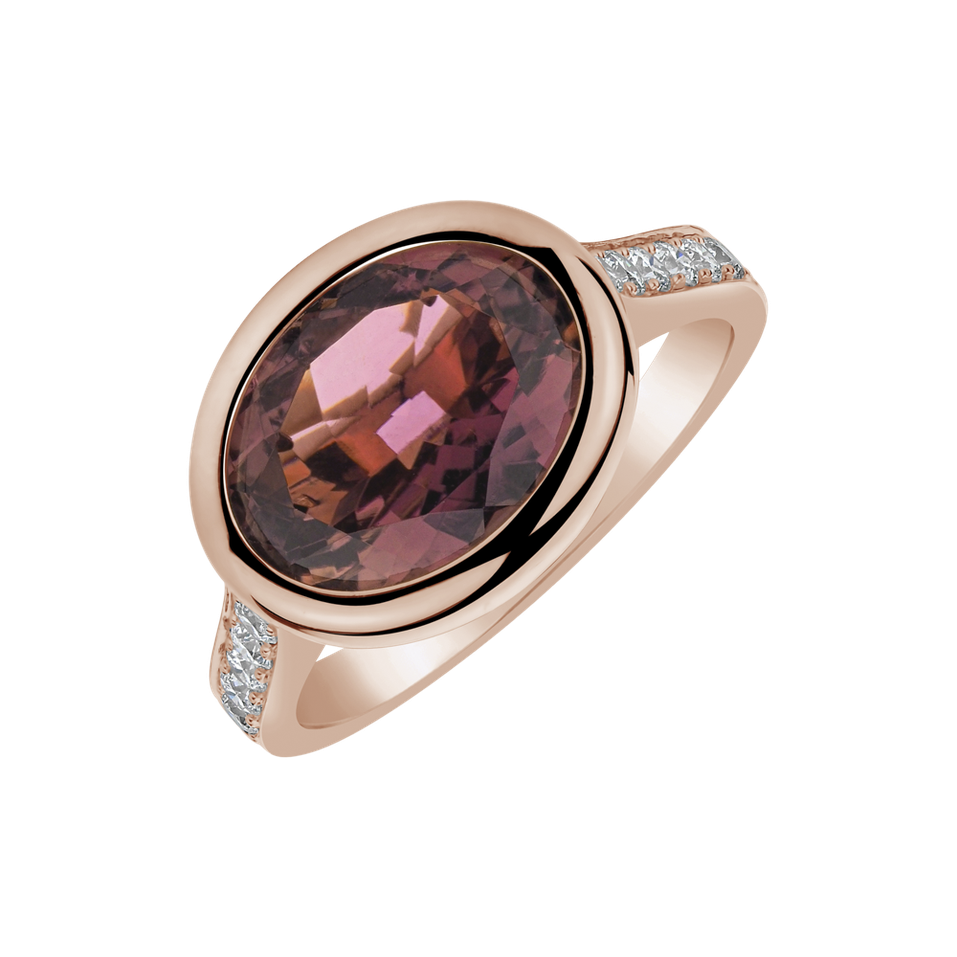 Tento prsteň z ružového zlata 14kt, obklopený trblietkami najčistejších diamantov a fialového turmalínu, je odvážnym vyjadrením elegancie a prírodnej krásy, ktorá obstojí v skúške času. Šperk je súčasťou kolekcie Fantasy.